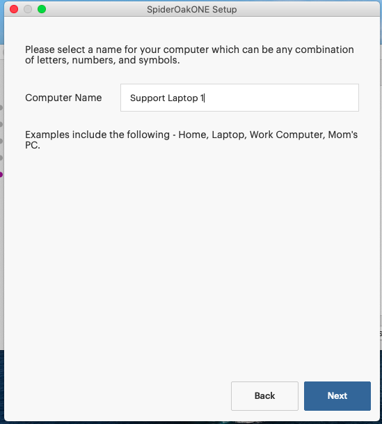 What’s a device? A device name is like an electronic name tag you assign to a physical computer. This name tag tells ONE which files you have selected to backup and sync on a particular computer. If you ever need to reinstall ONE for troubleshooting purposes, you can choose to reinstall an existing device and SpiderOak will remember all the files you’ve selected for backup and sync.