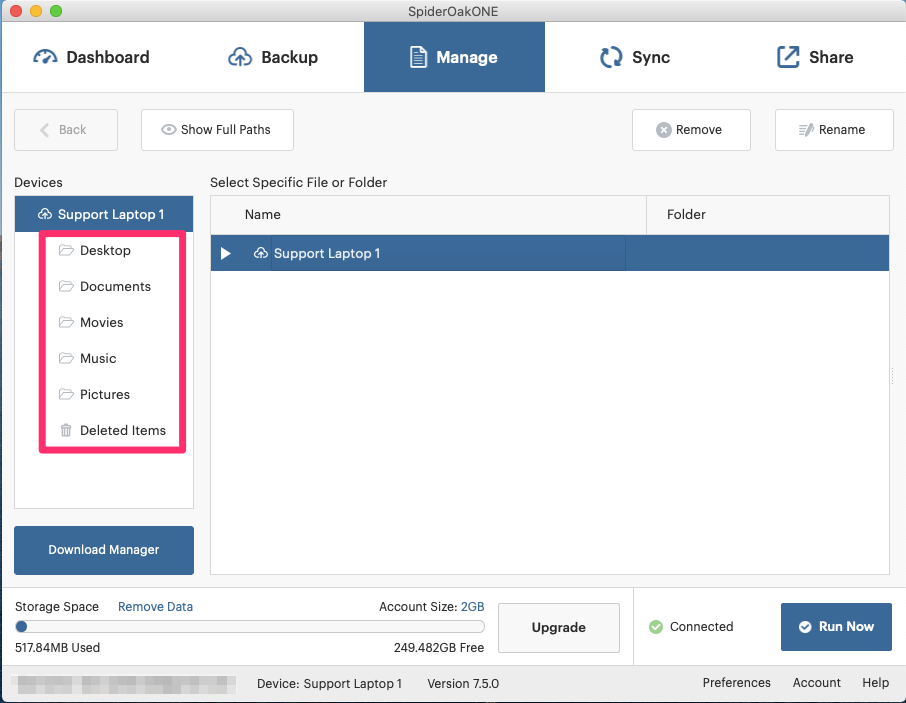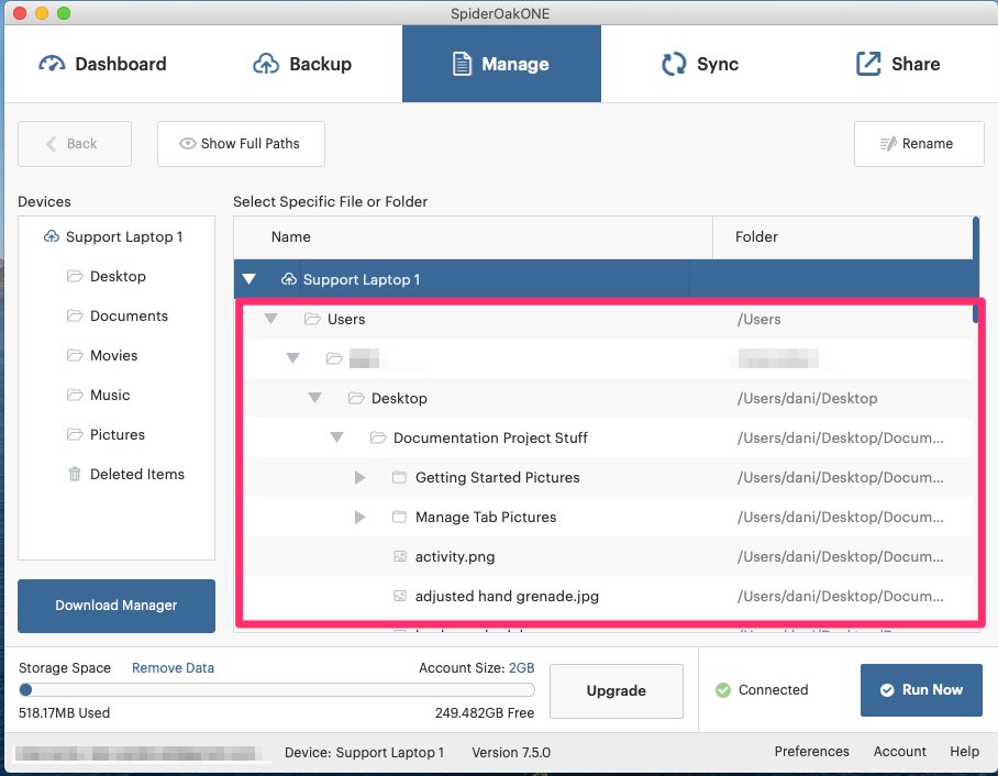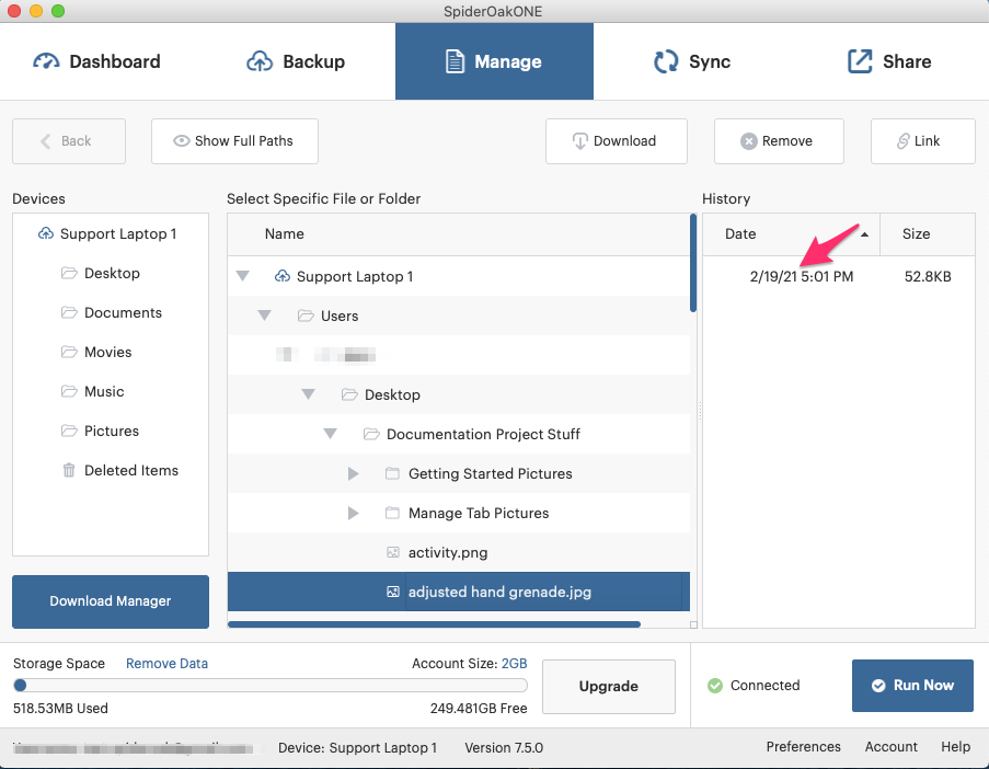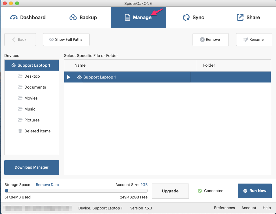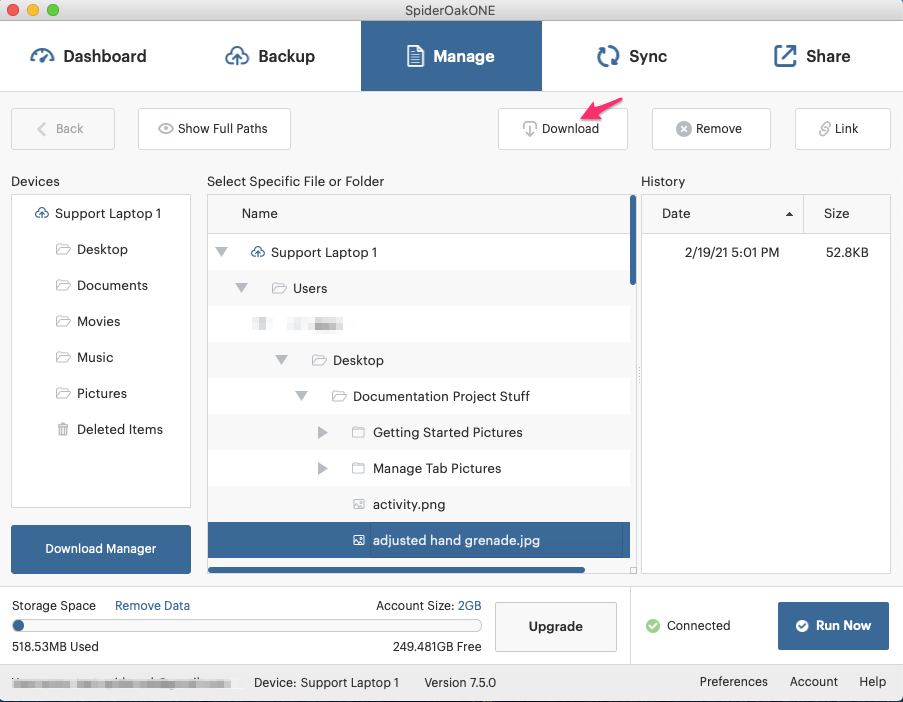 Este breve video te mostrará cómo gestionar los archivos que han sido respaldados en tu cuenta de SpiderOak ONE. En la pestaña Manage (Administrar), puedes acceder y administrar tus archivos respaldados, incluidas versiones históricas y las copias que ONE conserva de archivos que hayas eliminado de tu computadora local. También verás cómo descargarlos o eliminarlos.
