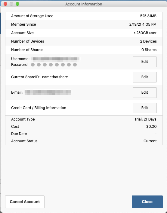 El acceso a la ventana de la cuenta se encuentra en la esquina inferior derecha de la aplicación de escritorio de SpiderOak ONE. Desde esta ventana de cuenta, encontrarás opciones relacionadas con aspectos generales de la cuenta y la facturación.